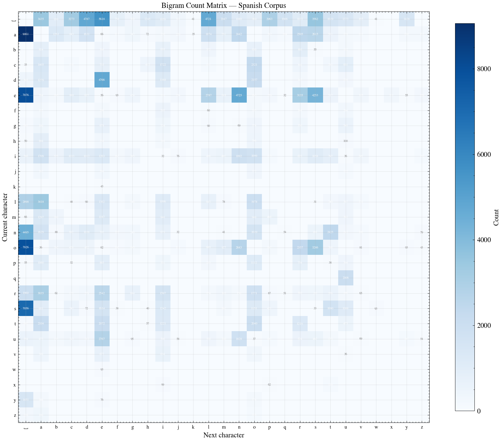 The idea: real Spanish has strong statistical regularities in which characters tend to appear next to each other. The pair de is extremely common; qz almost never occurs. We can exploit this by looking at bigram frequencies — how often each pair of consecutive characters appears in a large Spanish corpus.