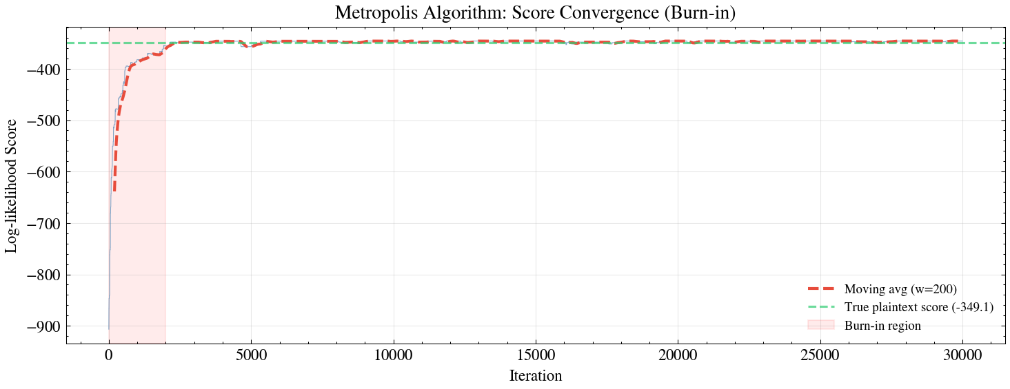 In practice, we discard the first several thousand samples (the burn-in period) and only use subsequent ones for inference. For our cipher problem, we’re using MCMC for optimization rather than sampling — we just want the highest-scoring cipher found — so burn-in is less of a concern. But it’s worth noting that this same machinery, when used for Bayesian inference, requires careful attention to convergence diagnostics.