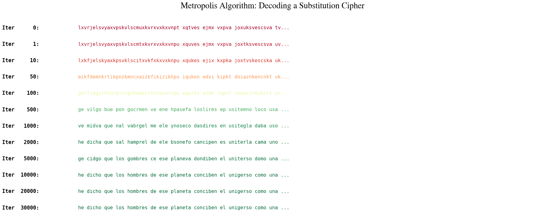 Now we have everything we need. The Metropolis algorithm constructs a Markov chain over the space of all \(27!\) possible ciphers, biased to visit ciphers that produce Spanish-like decryptions more often