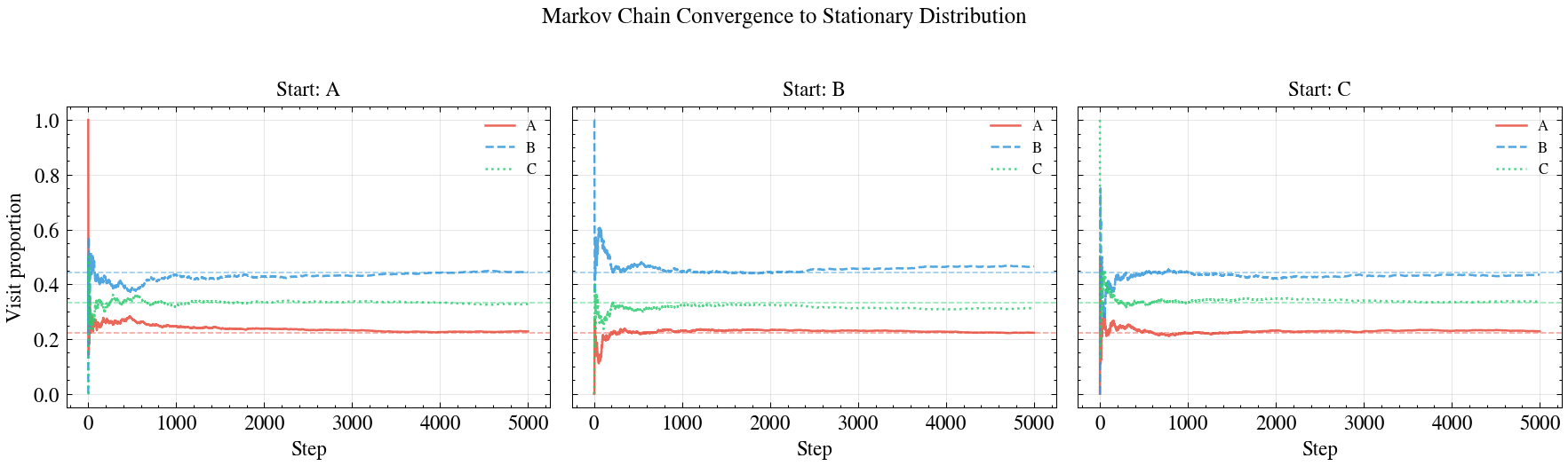 What makes this remarkable is that the stationary distribution doesn’t depend on the starting state. Start from \(B\) or \(C\) instead of \(A\), and you’ll converge to the same \(\pi\). This is guaranteed (under mild conditions: the chain must be irreducible — you can get from any state to any other — and aperiodic — you don’t get trapped in deterministic cycles).
