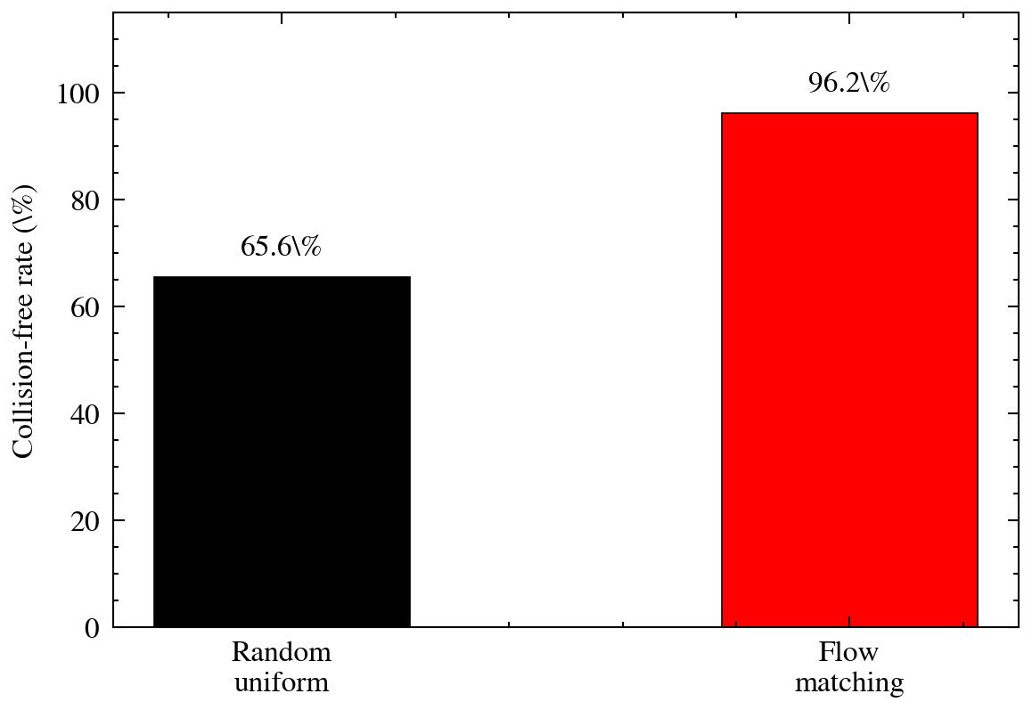 Applied to robotics, this translates into a generator that produces valid arm configurations without explicit collision checking at test time. The model learns the shape of the free configuration space from data alone, achieving 96.2% collision-free accuracy compared to 65.6% for random sampling.