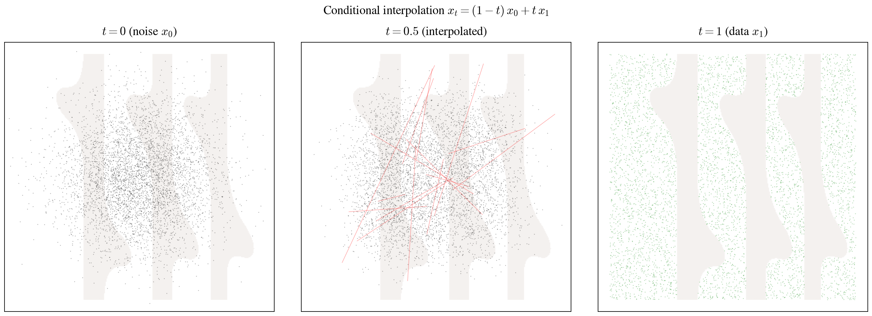 Putting it all together, the training procedure samples a noise point \(x_0 \sim \mathcal{N}(0, I)\), a data point \(x_1\) from the training set, and a time \(t \sim \mathcal{U}[0, 1]\). It constructs the interpolant \(x_t = (1 - t)\, x_0 + t\, x_1\) and regresses the network output against the target velocity: