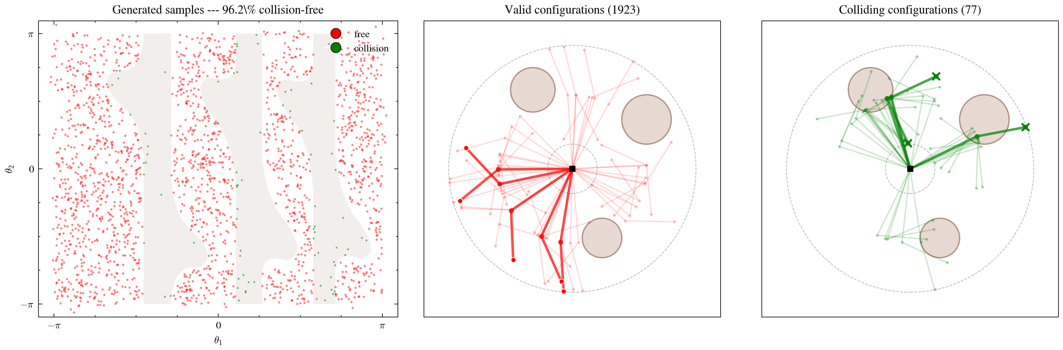 If we sampled \((\theta_1, \theta_2)\) uniformly at random across \([-\pi, \pi]^2\), the collision-free rate would be about 65.6% — determined by the fraction of C-space occupied by obstacles. Flow matching improves this to 96.2%, a substantial gain that would compound in downstream applications where every invalid sample requires an expensive re-planning step.