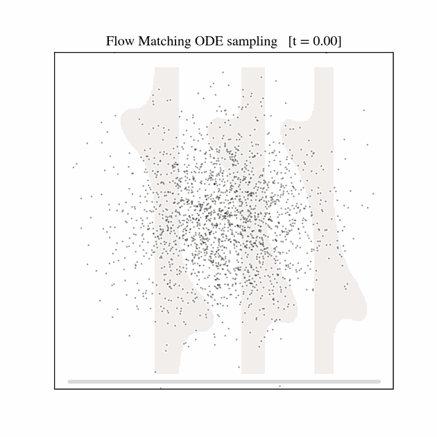 Flow matching constructs a time-dependent velocity field \(v_\theta(x_t, t)\) that defines an ordinary differential equation (ODE):