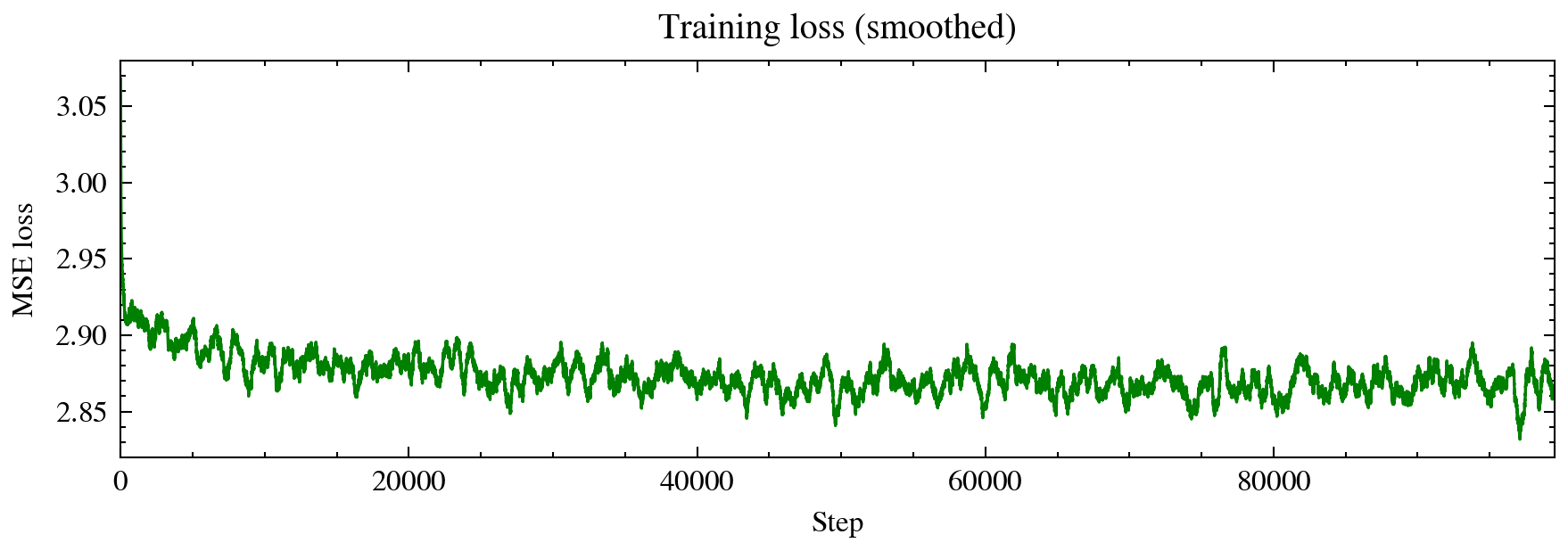 The implementation is minimal: an MLP with sinusoidal time conditioning, trained for 100k steps on an MSE loss. Sampling is a 100-step Euler integration — deterministic, fast, and parallelizable.