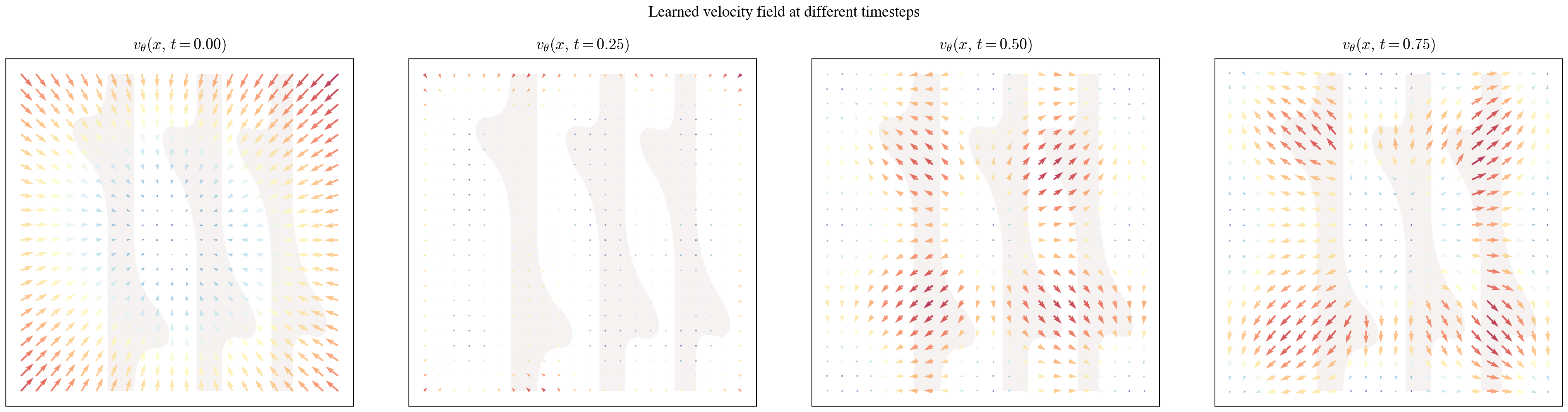 We can visualize what the network actually learned by evaluating \(v_\theta(x, t)\) on a grid at different timesteps. This reveals the structure of the transport: