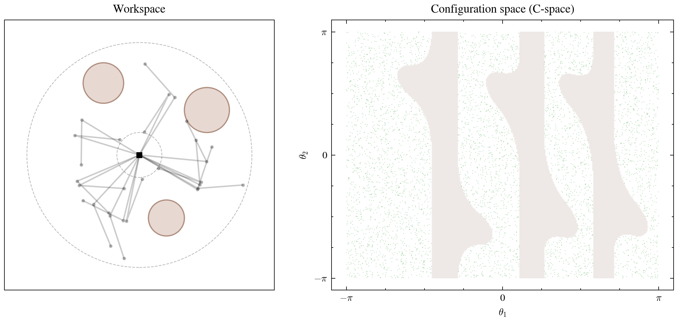 The left panel shows the physical arm and obstacles. The right panel shows what happens when we map the obstacle boundaries into joint angle space: the free region fragments into irregular channels separated by curved obstacle zones. If we sampled \((\theta_1, \theta_2)\) uniformly at random, roughly 35% of configurations would collide — a significant waste if we need valid configurations for motion planning or policy learning.