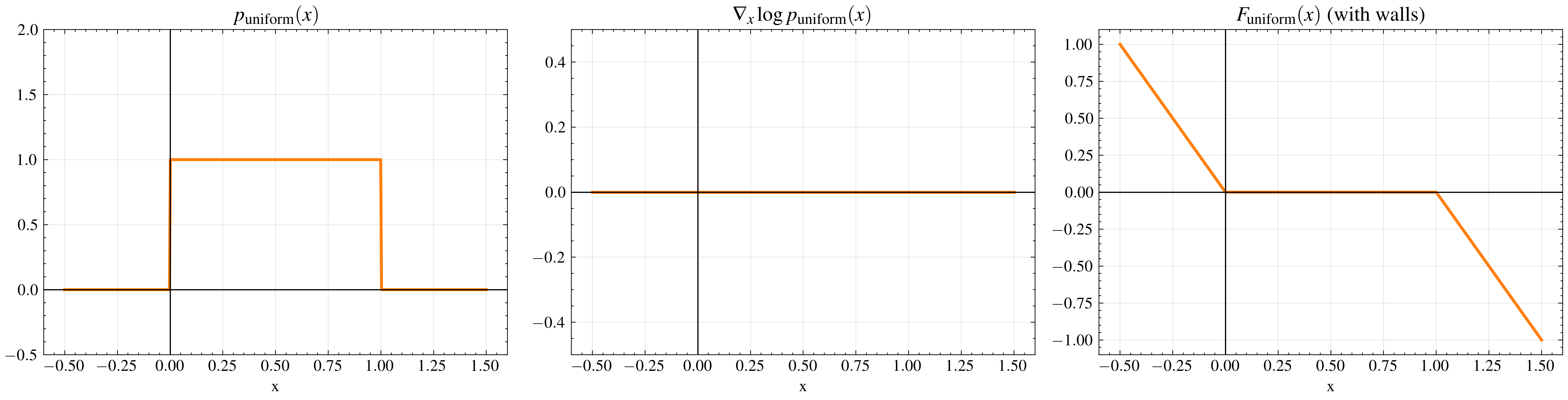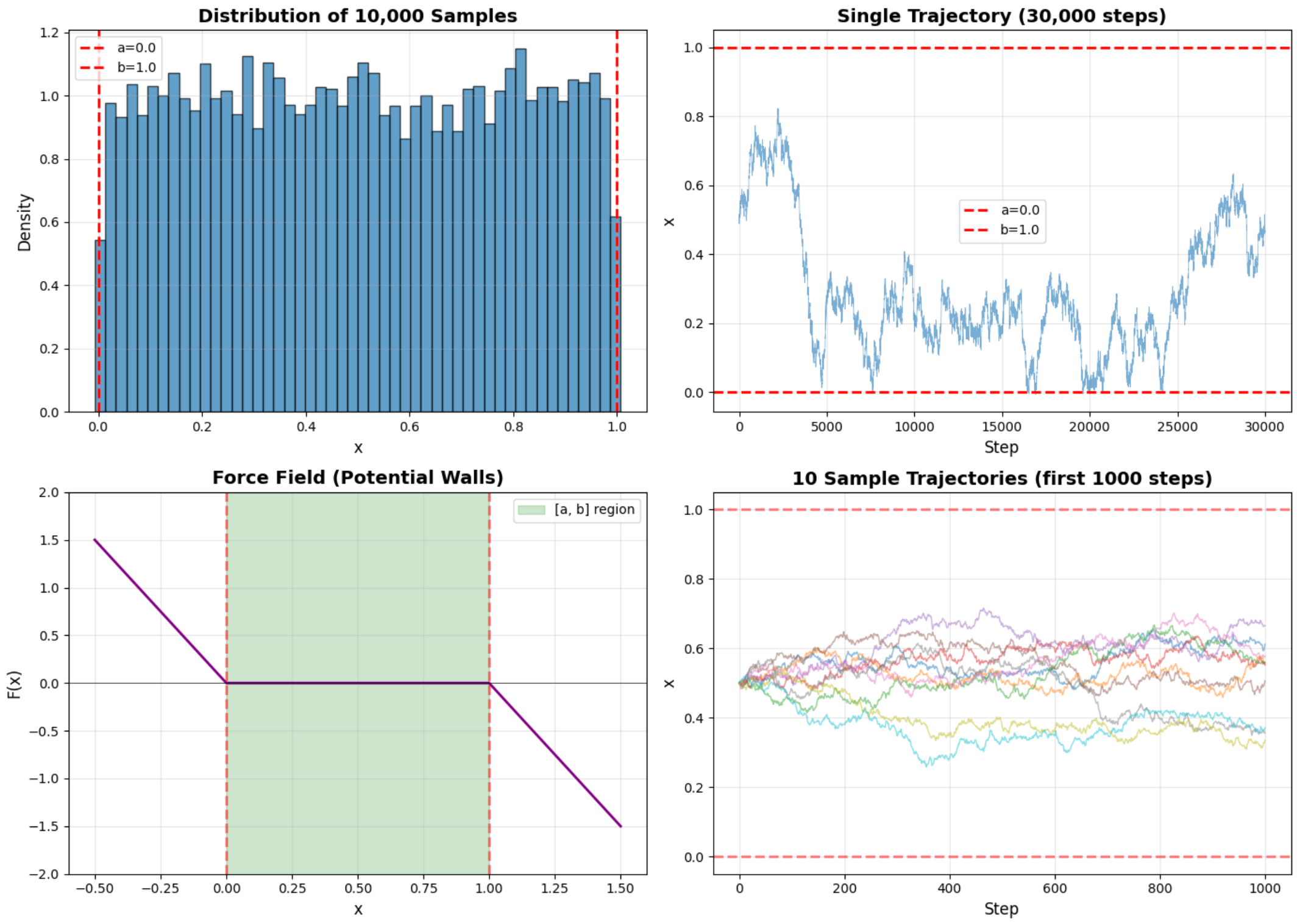 However, this flat derivative could lead samples to drift outside the valid range, so we need to put “walls” that keep us inside the sample space we’re looking for. These walls act like a restoring force that pushes samples back when they wander outside $[0, 1]$.