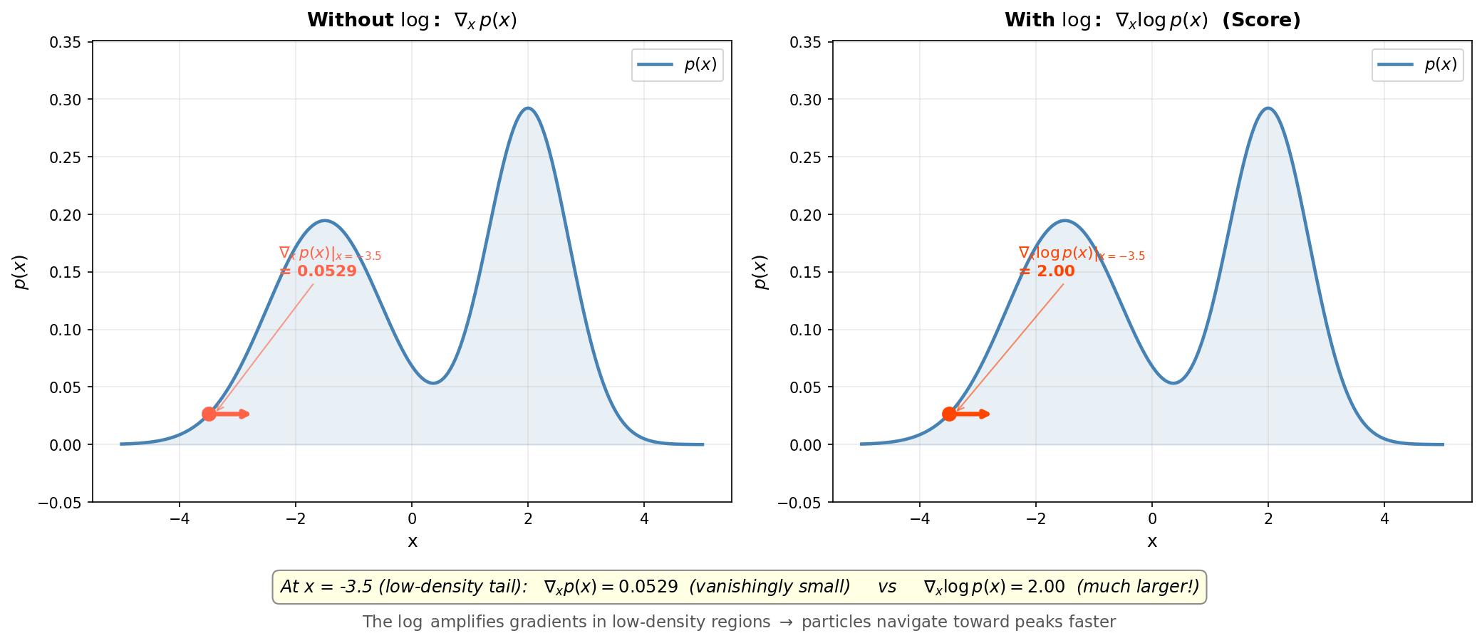 The logarithm amplifies the magnitude of the gradient in low-density regions, allowing us to reach the most probable samples faster. Without it, the gradients in the tails of the distribution would be vanishingly small, making it hard to navigate toward the peaks.