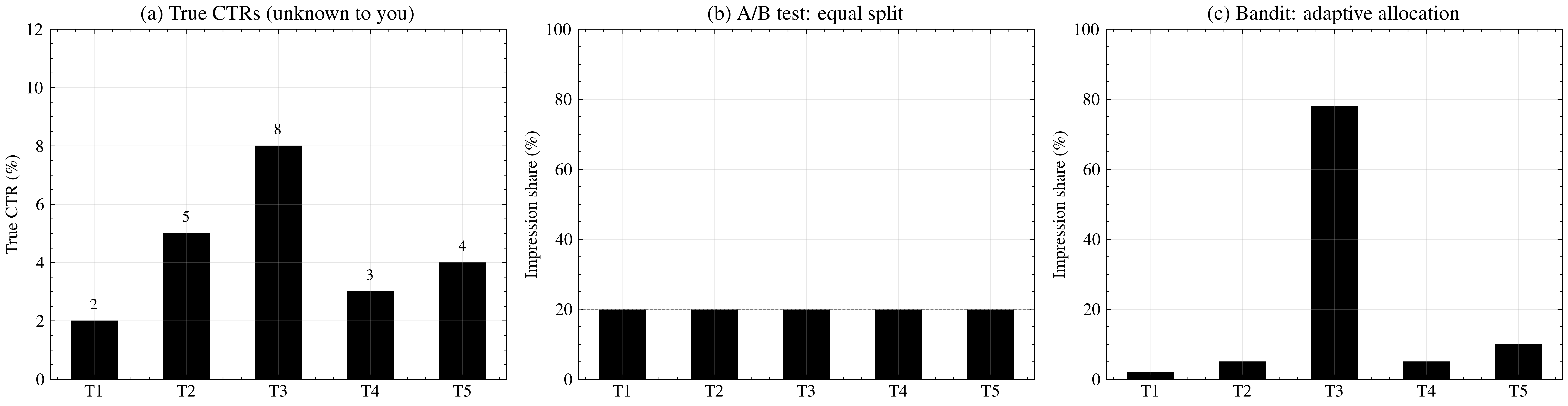 Say T3 has an 8% CTR and T1 has a 2% CTR. An equal-split test keeps showing T1 to 20% of your audience for the entire test. Every impression spent on T1 instead of T3 is a potential click lost.