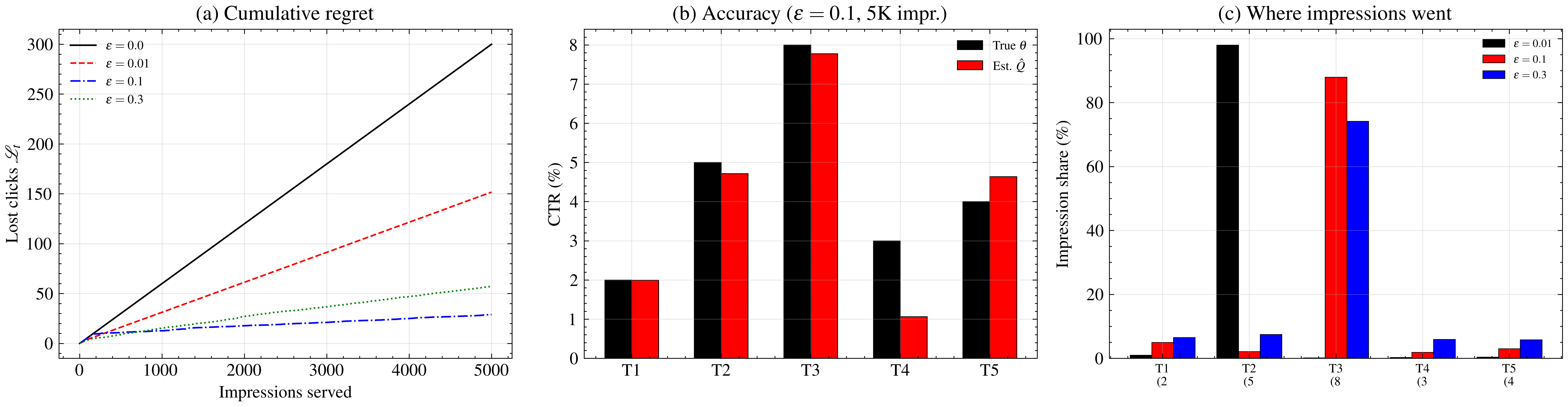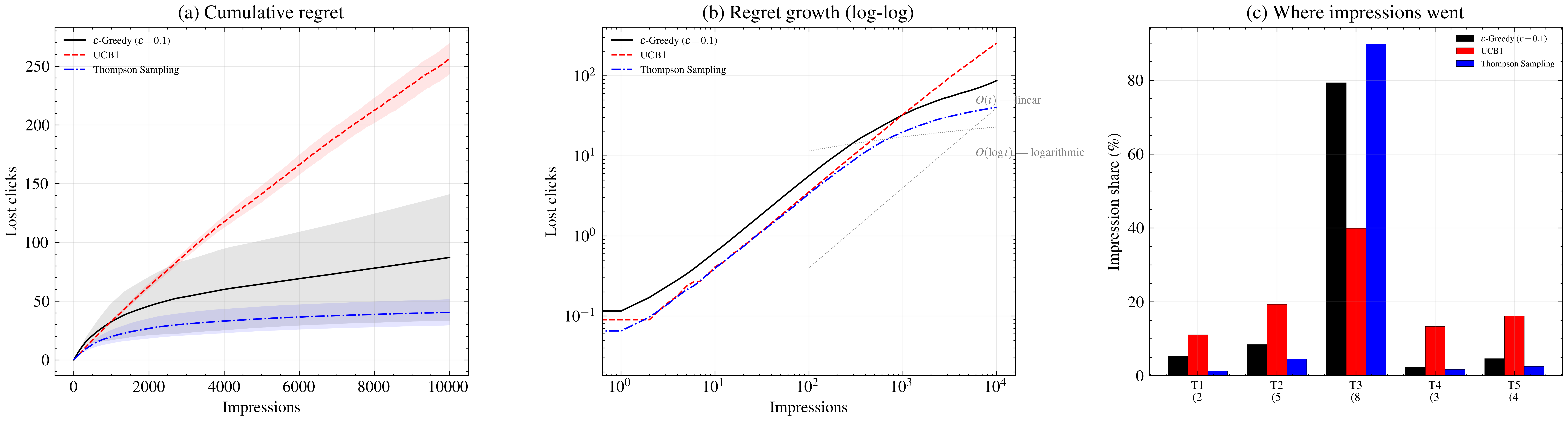 The key result: $\varepsilon$-Greedy regret grows linearly — it never stops wasting impressions. UCB1 and Thompson Sampling grow logarithmically — the regret curve flattens as they lock onto the best thumbnail. Thompson typically achieves the lowest total regret.