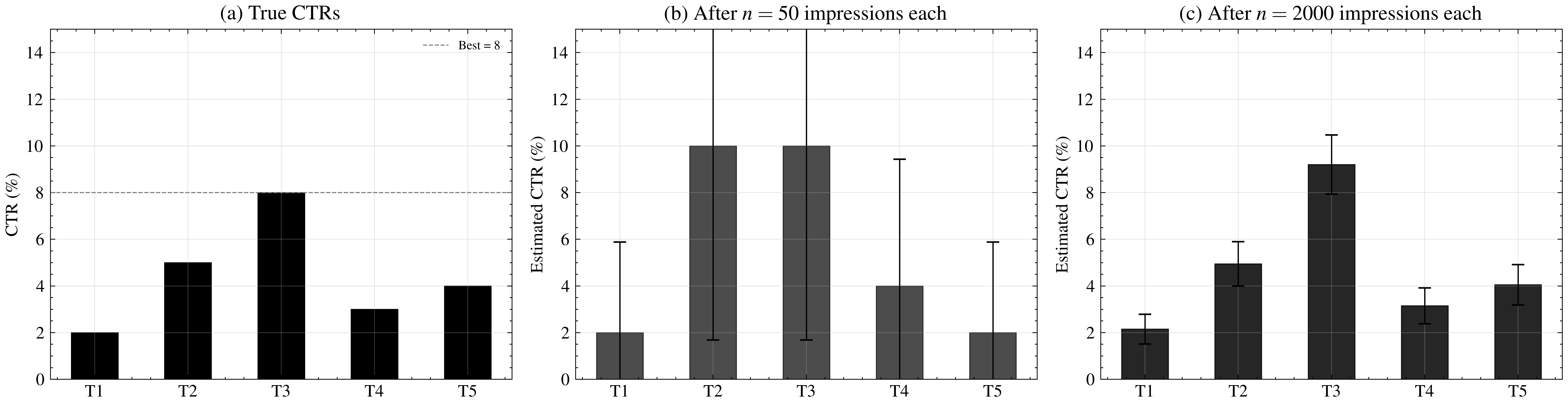 T3 looks great at 8.3%, but you’ve only shown it 12 times. That could easily be noise — maybe nobody happened to be in the mood to click. Or maybe it really is the best. You should show it more to find out.