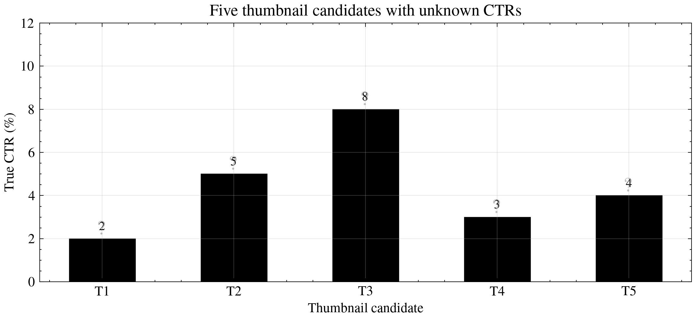 YouTube actually does something like this internally. When you upload a video, it can show different thumbnails to different viewers and track which one gets the most clicks. But how should it allocate impressions across the candidates?