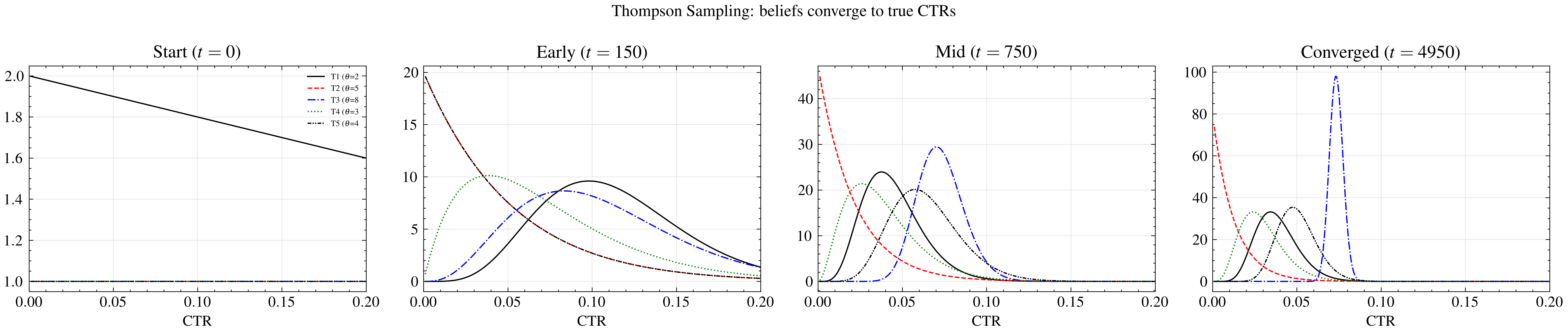 If T3 has received 3 impressions, 1 click: the belief is $\text{Beta}(2, 3)$ — a very wide distribution spanning nearly the whole range from 0% to 70%. You have almost no idea what T3’s true CTR is.