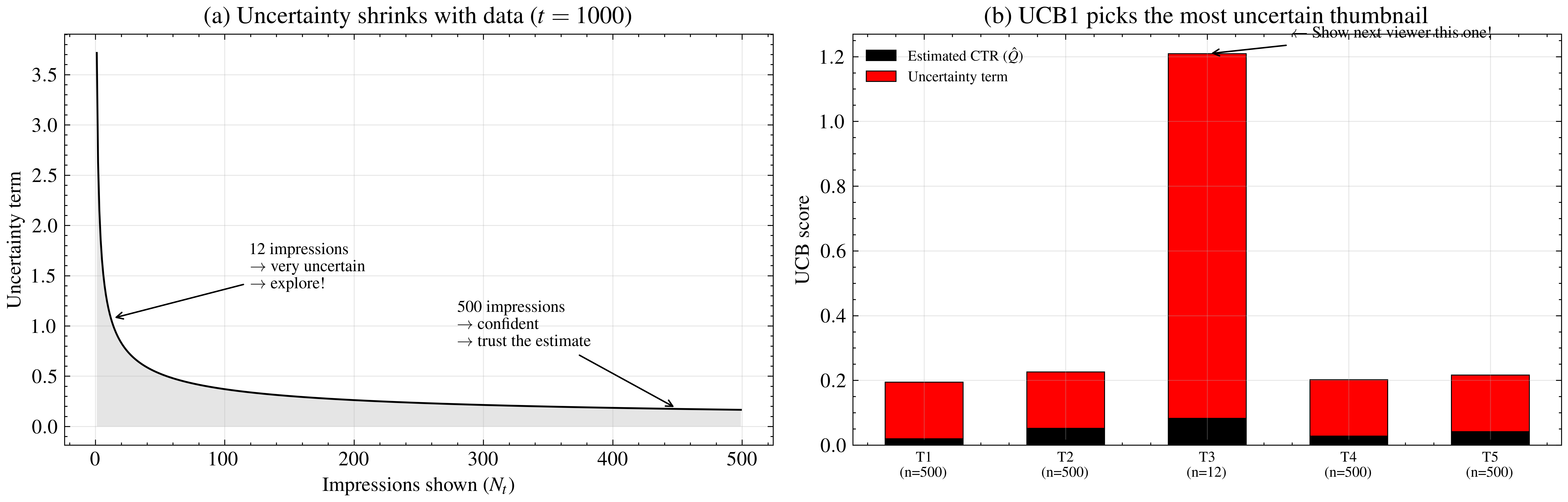 \[\text{UCB score}(a) = \underbrace{\hat{Q}_t(a)}_{\text{estimated CTR}} + \underbrace{\sqrt{\frac{2 \ln t}{N_t(a)}}}_{\text{how uncertain you are}}\]Then it shows the thumbnail with the highest score.